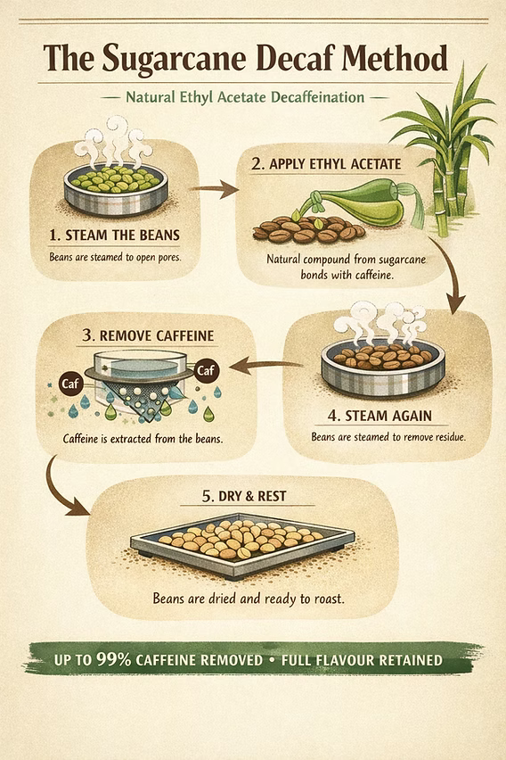 Door de milde rietsuikermethode verwijderen we op natuurlijke wijze de cafeïne uit deze koffiebonen.